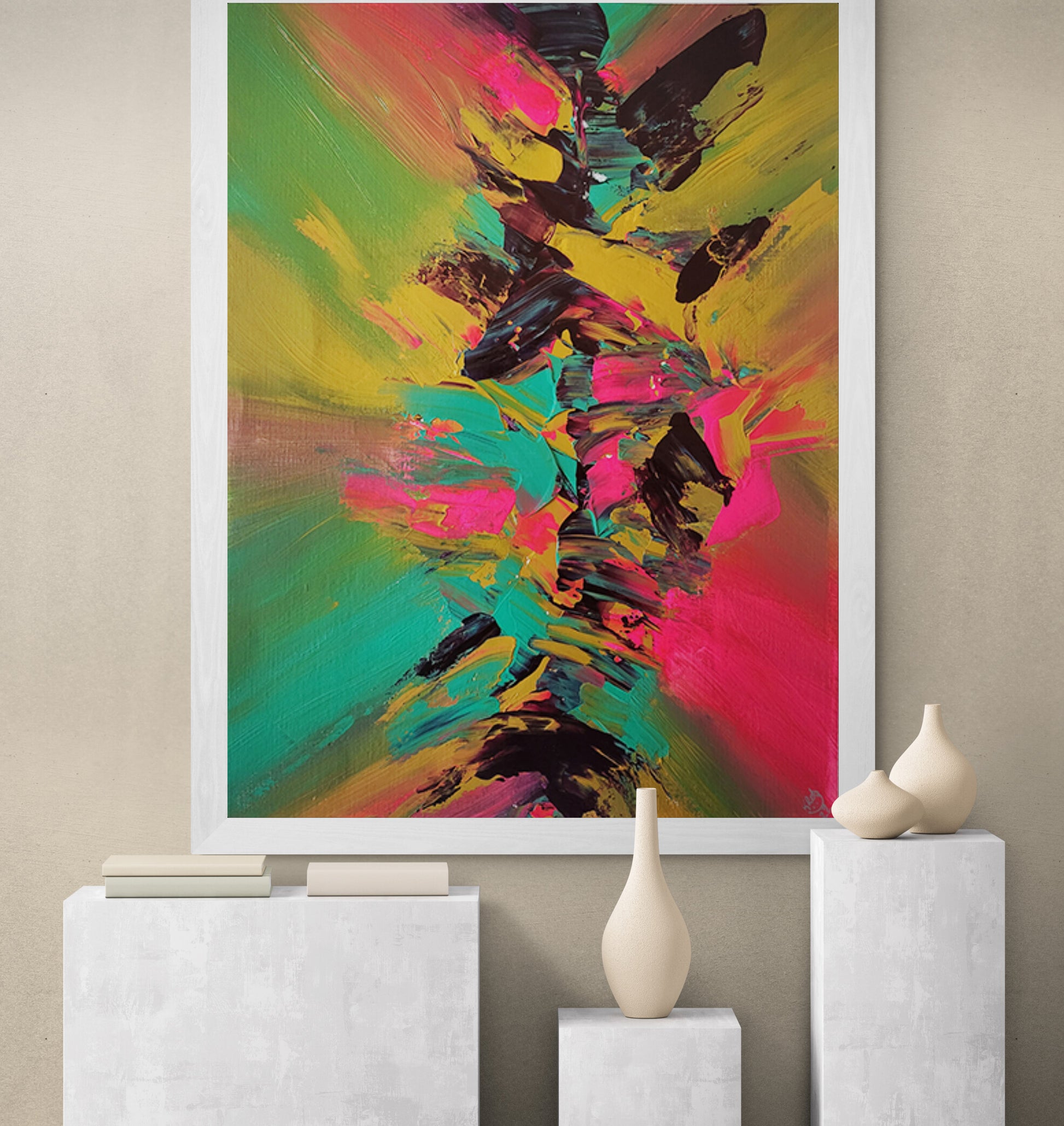 Introducing "Accession" – a stunning and vibrant work of art, crafted on premium canvas paper with archival-grade acrylic paint. Measuring 16x20 inches, this masterpiece comes ready to be framed and displayed. Enjoy complimentary shipping and receive a matching pillow as a token of appreciation.