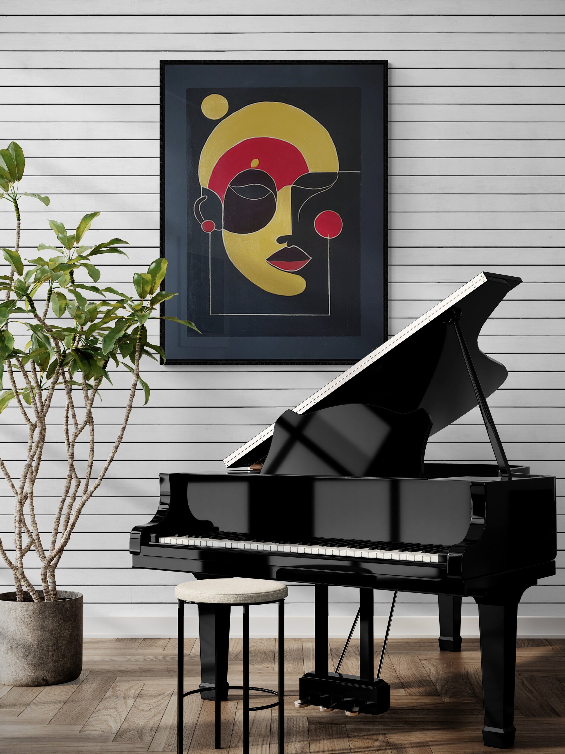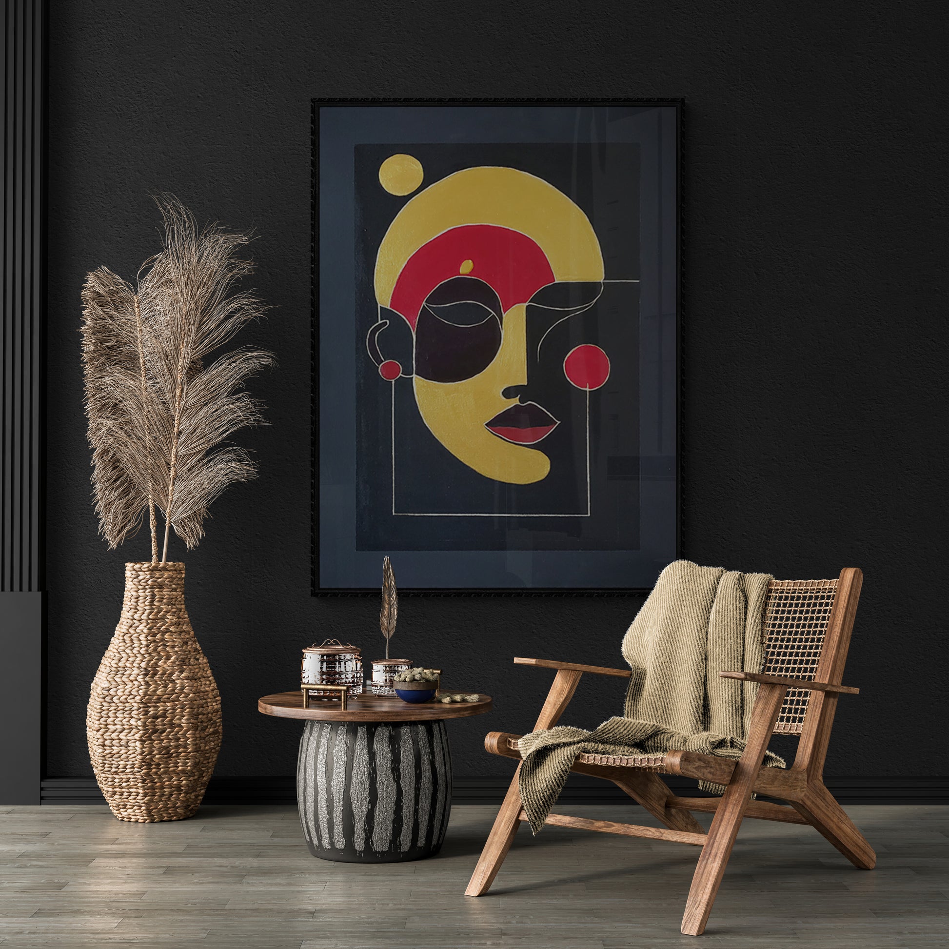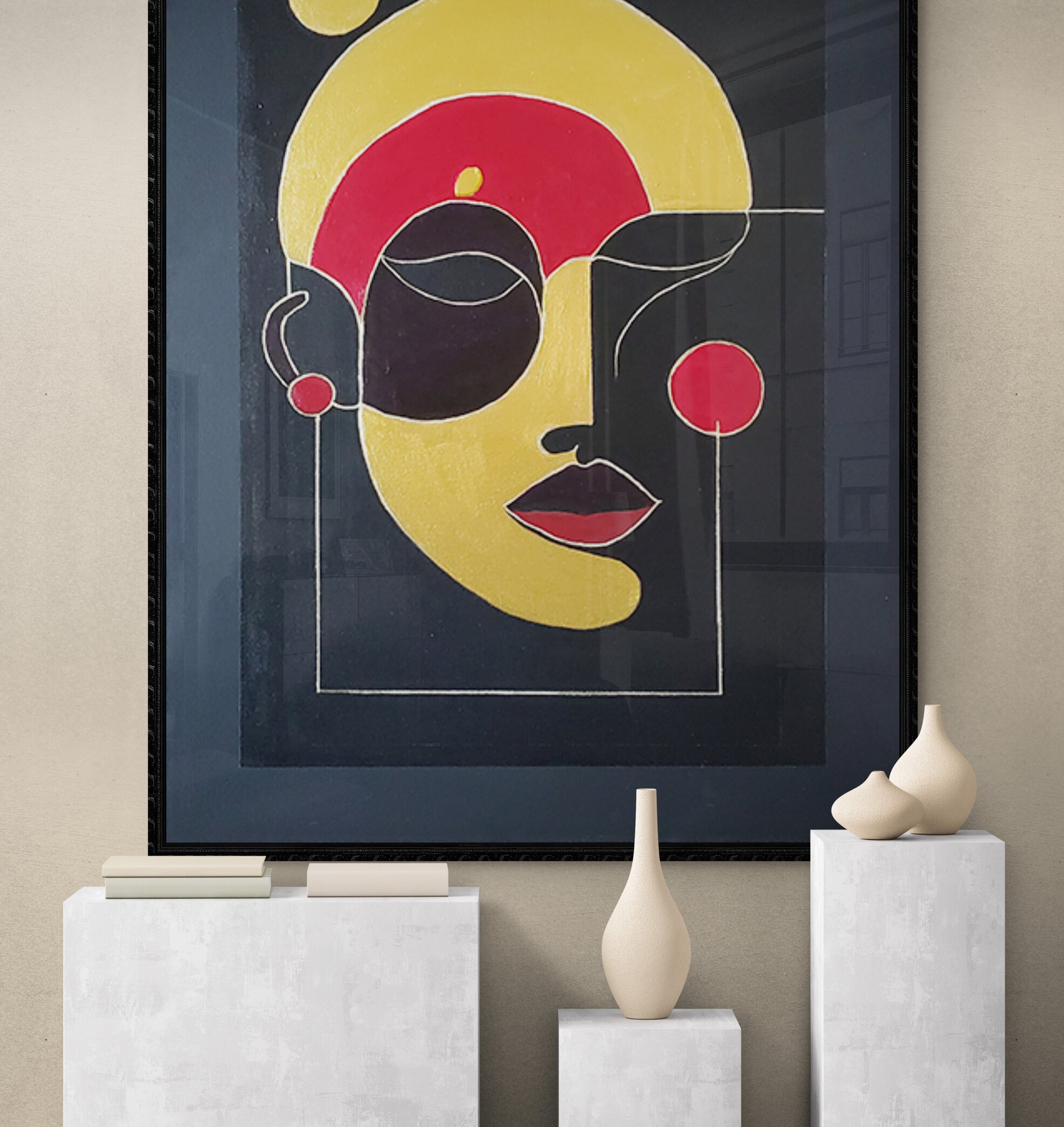 This captivating 16x20 inch painting, created with fine acrylic paint, showcases a striking abstract composition. The artwork features a large, golden-yellow circular shape dominating the upper portion of the canvas, with a smaller yellow circle positioned to its upper left. The central area of the painting is a blend of vibrant red, yellow, and black hues, creating a dynamic and visually stimulating effect. The use of geometric shapes and bold colors draws the viewer's attention, inviting contemplation and interpretation. The painting is framed by a black border, enhancing the contrast and depth of the composition. The artist's signature is visible in the bottom right corner, adding a personal touch to this intriguing piece. Ships FREE