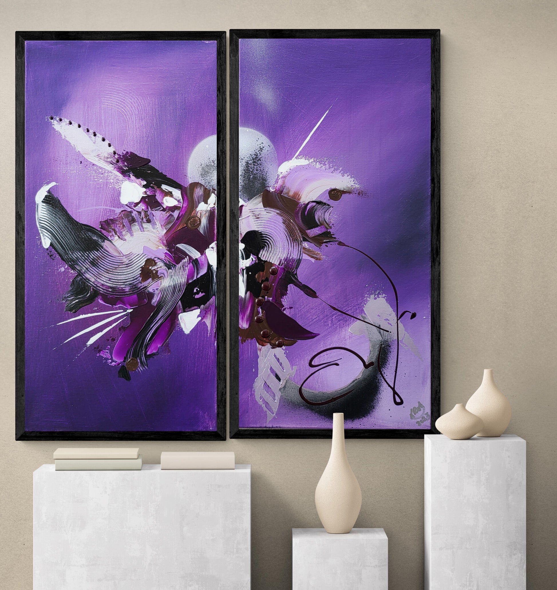 Passione Viola are 2 10x20 inch wrapped canvas', created with fine acrylic paint and have a natural finish. These pieces are signed, come ready to hang and ships FREE. Discover the beauty of art with Passione Viola! Experience the vibrancy of fine acrylic paint and the stunning natural finish of two 10x20 inch wrapped and ready-to-hang canvas'. Best of all, shipping is free—so you can enjoy your art wherever you are!