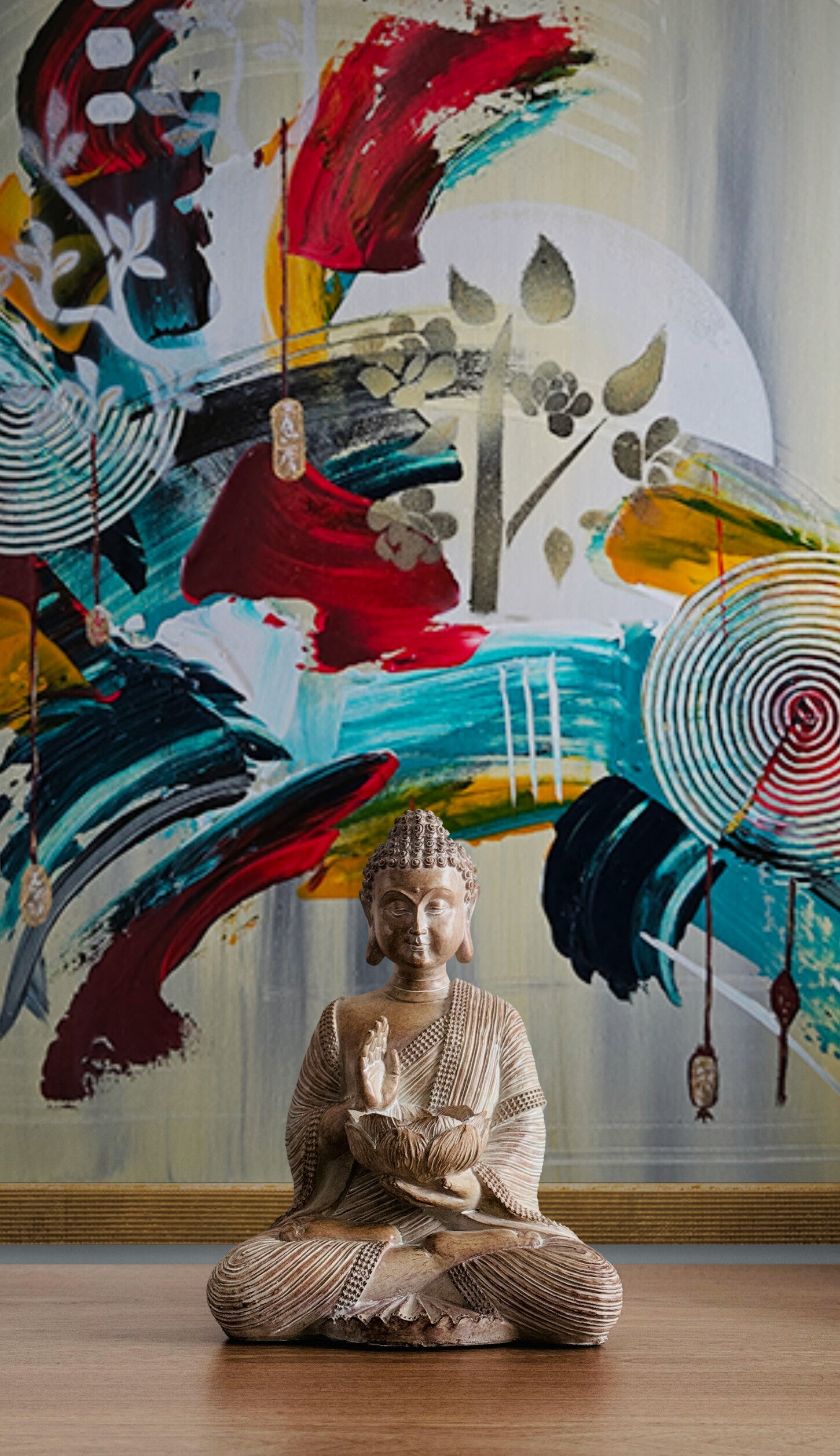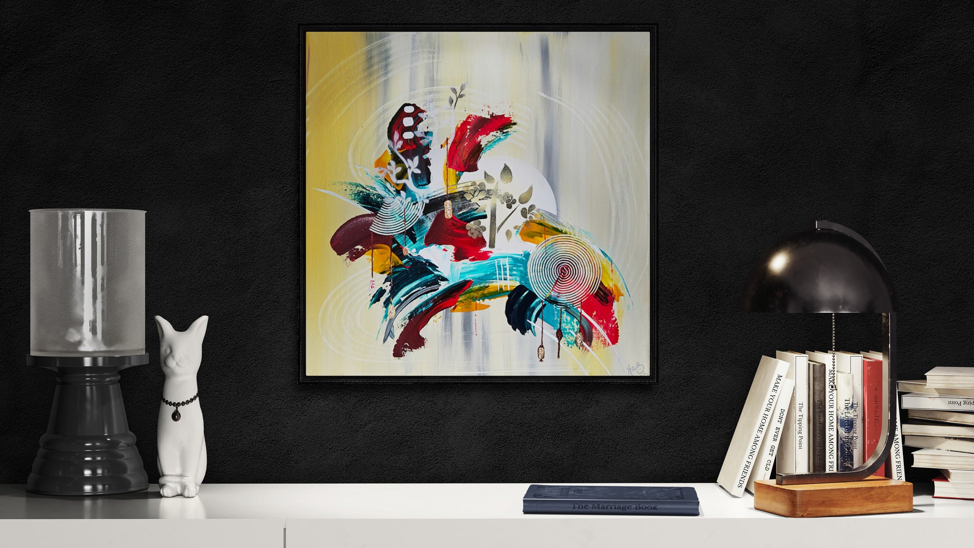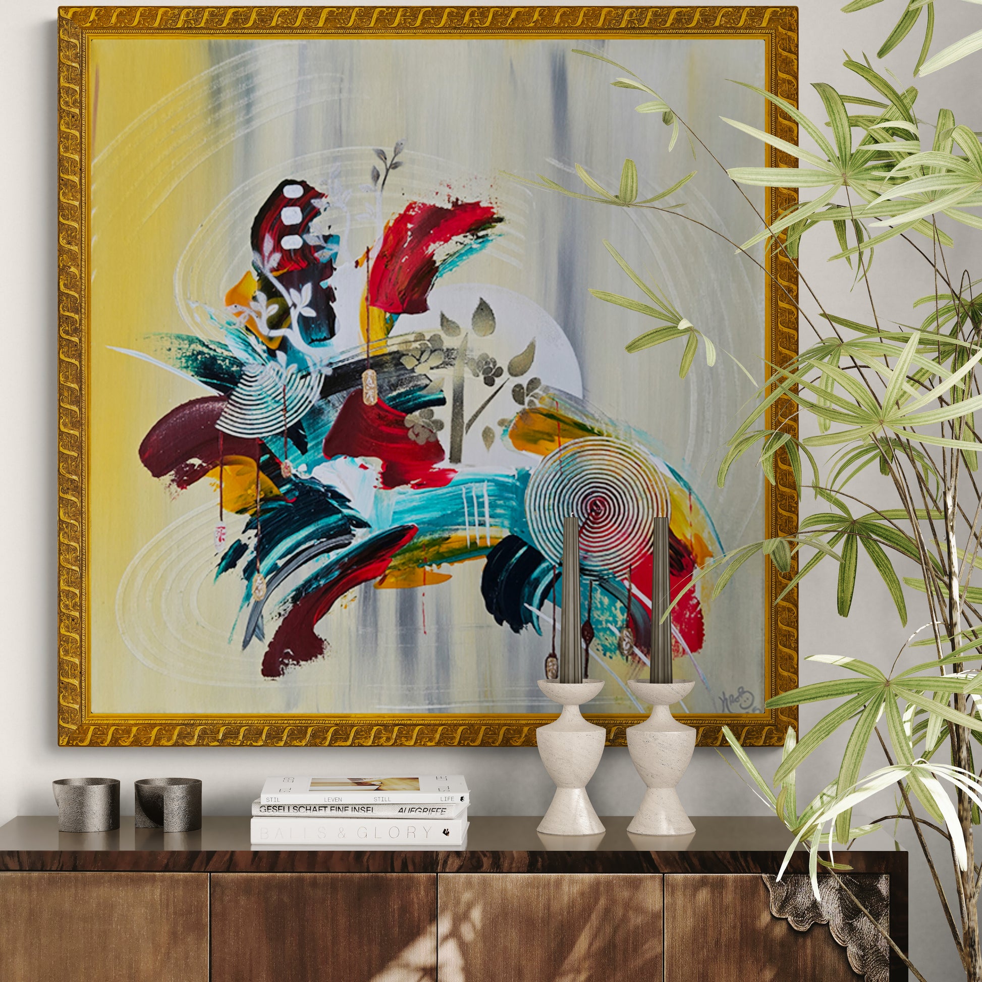 A bloom born of dream and memory, *Yumehana* unfolds across a layered field of muted golds, grays, and moonlit white. Bold strokes of crimson, turquoise, and mustard yellow dance with botanical silhouettes and dreamcatcher rings, evoking a quiet rhythm of spirit and nature. A pale orb—sun or moon—anchors the composition, casting an ethereal glow over the abstract terrain. This piece invites reflection, movement, and the soft hush of something remembered.